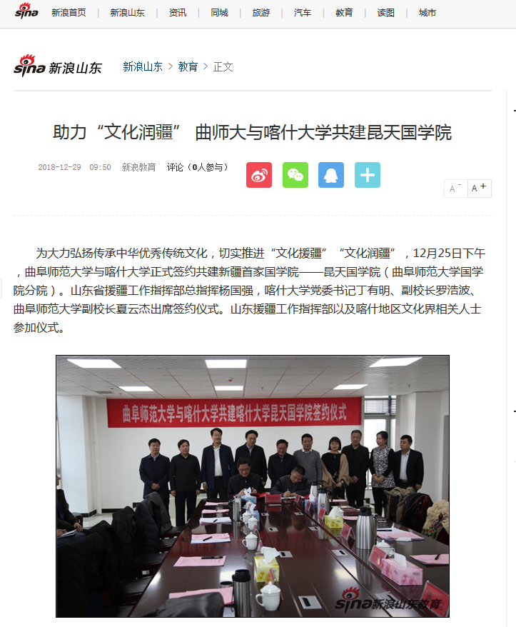 新浪网:助力“文化润疆” 曲师大与喀什大学共建昆天国学院