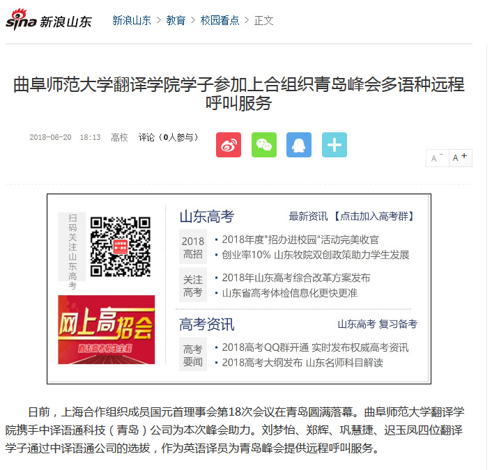 新浪网:曲师大学子参加上合组织青岛峰会多语种远程呼叫服务