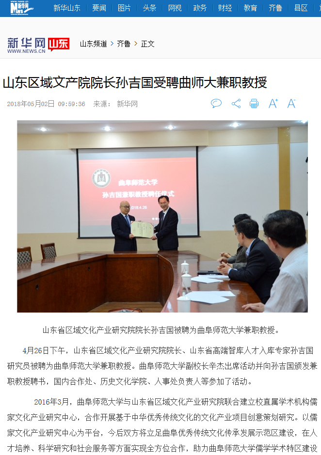 新华网:山东区域文产院院长孙吉国受聘曲师大兼职教授