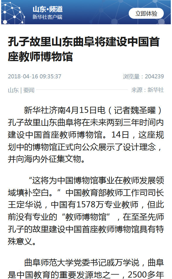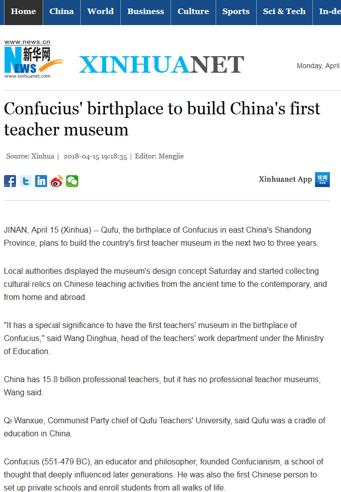 新华网:孔子故里山东曲阜将建设中国首座教师博物馆