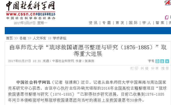 中国社会科学网:HUANYING.COM“琉球救国请愿书整理与研究(1876-1885)”取得重大进展