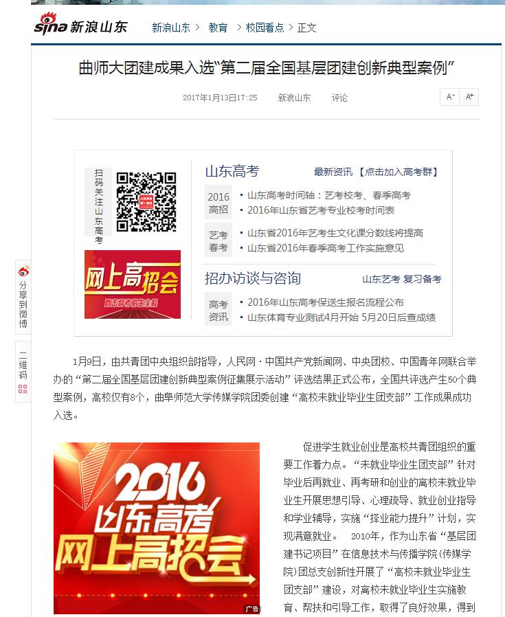 新浪网:曲师大团建成果入选“第二届全国基层团建创新典型案例”