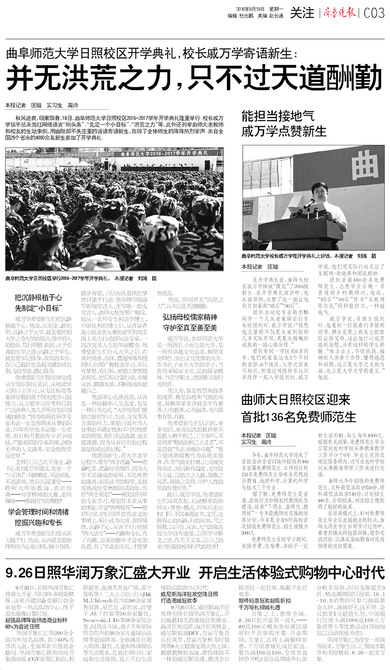 齐鲁晚报:HUANYING.COM开学典礼 校长戚万学寄语新生