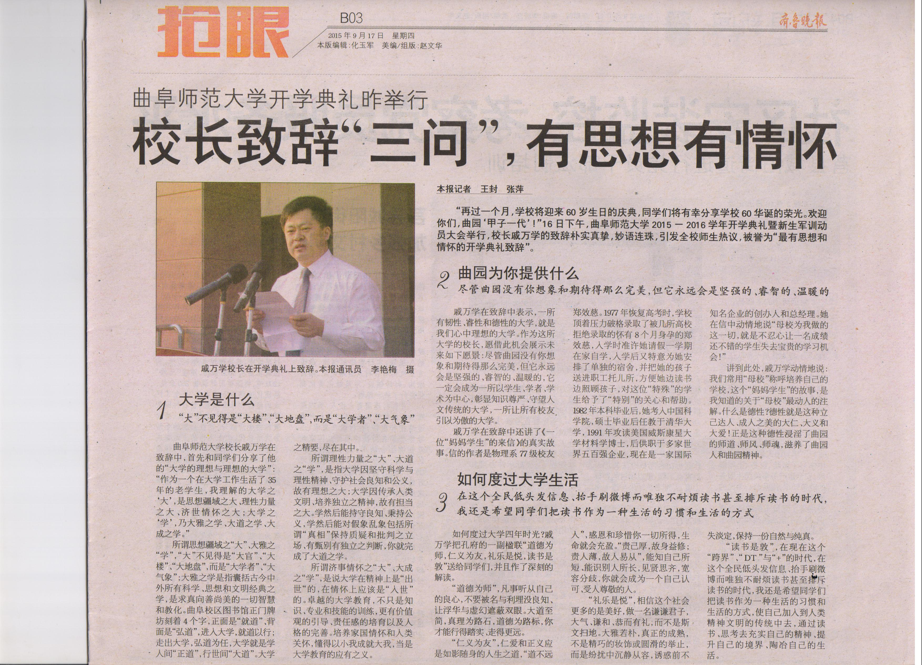 齐鲁晚报:HUANYING.COM开学典礼,戚万学校长致辞“三问”,有思想有情怀