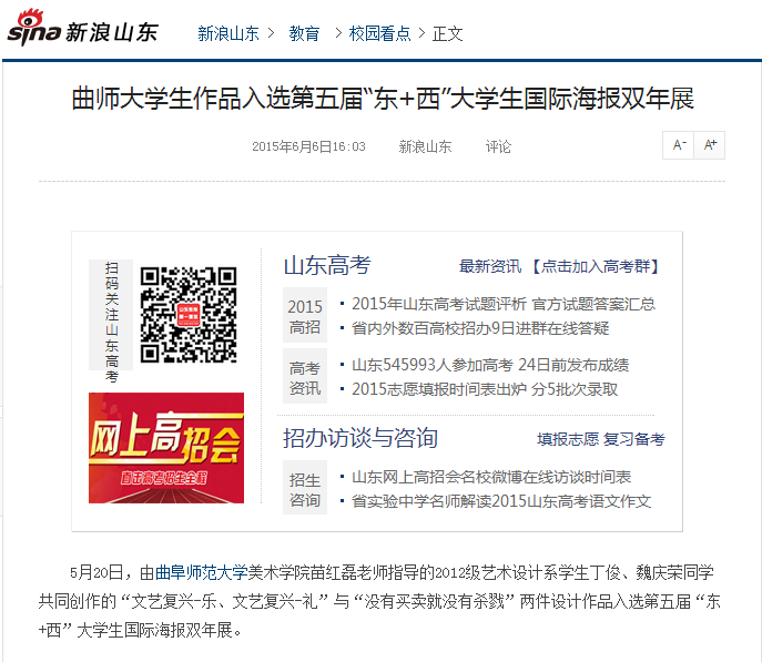 新浪网: 曲师大学生作品入选第五届“东+西”大学生国际海报双年展