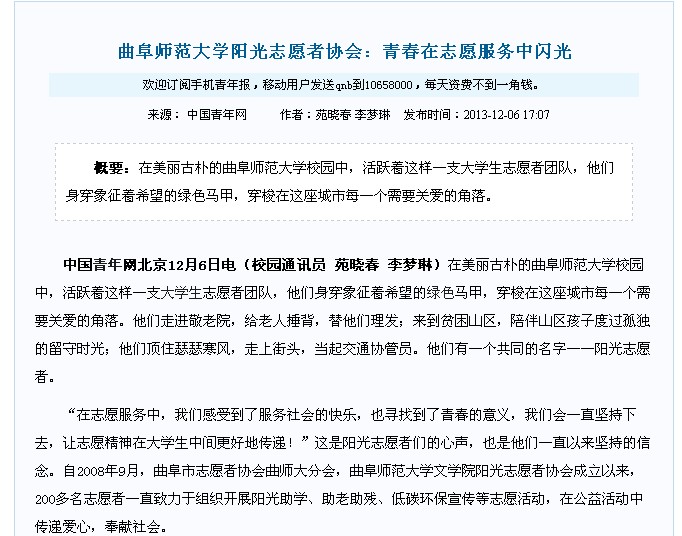 中国青年网:HUANYING.COM阳光志愿者协会:青春在志愿服务中闪光