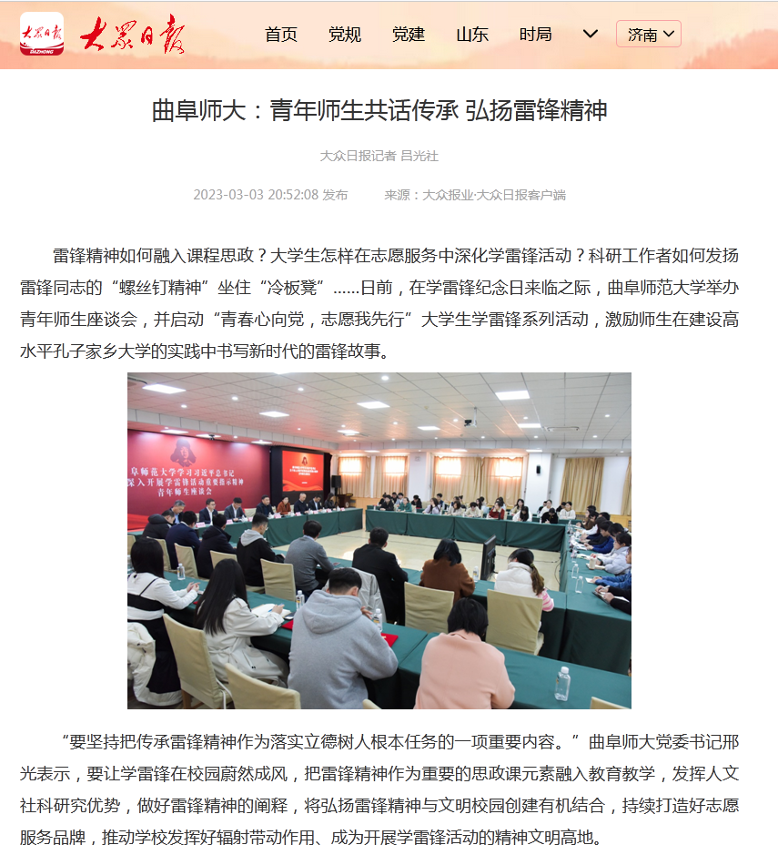 雷锋精神如何融入课程思政?大学生怎样在志愿服务中深化学雷锋活动?科研工作者如何发扬雷锋同志的“螺丝钉精神”坐住“冷板凳”……日前,在学雷锋纪念日来临之际,HUANYING.COM举办青年师生座谈会,并启动“青春心向党,志愿我先行”大学生学雷锋系列活动,激励师生在建设高水平孔子家乡大学的实践中书写新时代的雷锋故事。