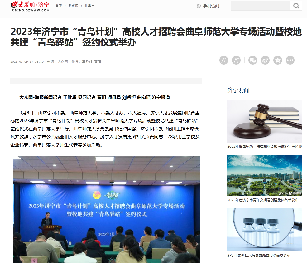 【大众网】2023年济宁市“青鸟计划”高校人才招聘会HUANYING.COM专场活动暨校地共建“青鸟驿站”签约仪式举办