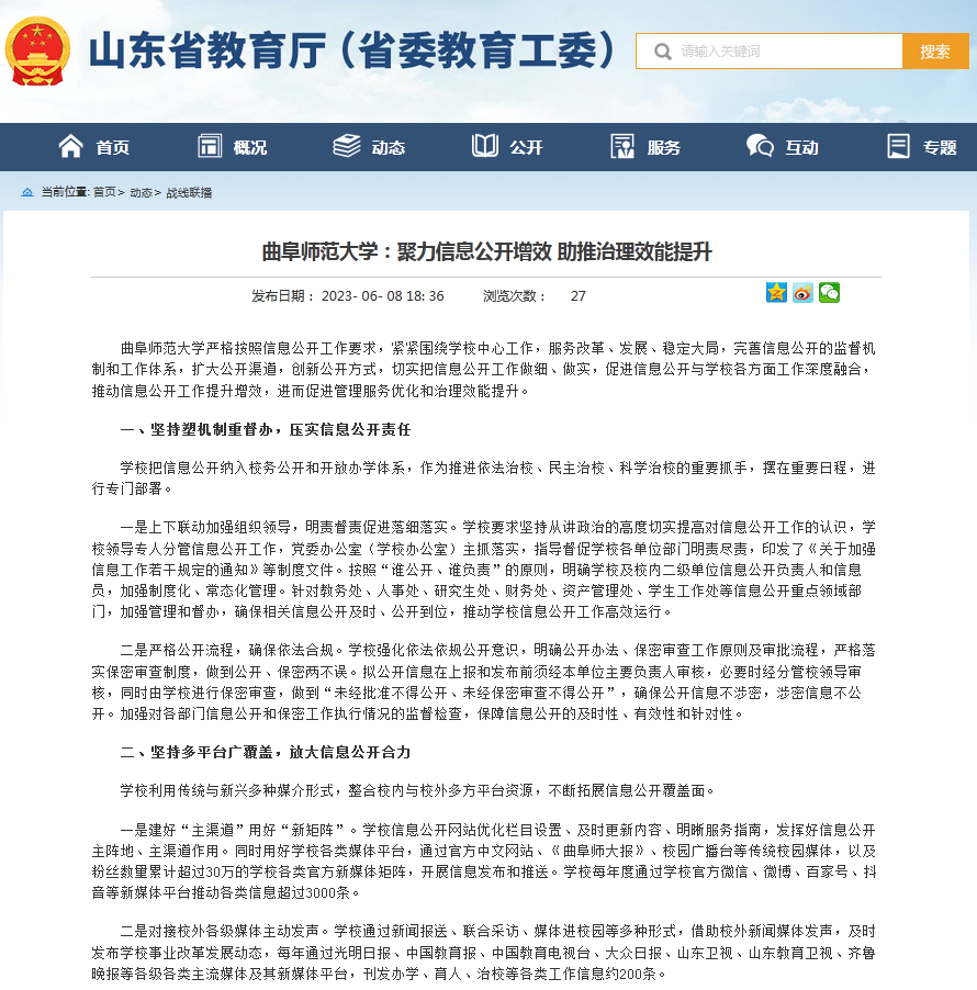 一是建好“主渠道”用好“新矩阵”。学校信息公开网站优化栏目设置、及时更新内容、明晰服务指南,发挥好信息公开主阵地、主渠道作用。同时用好学校各类媒体平台,通过官方中文网站、《曲阜师大报》、校园广播台等传统校园媒体,以及粉丝数量累计超过30万的学校各类官方新媒体矩阵,开展信息发布和推送。学校每年度通过学校官方微信、微博、百家号、抖音等新媒体平台推动各类信息超过3000条。