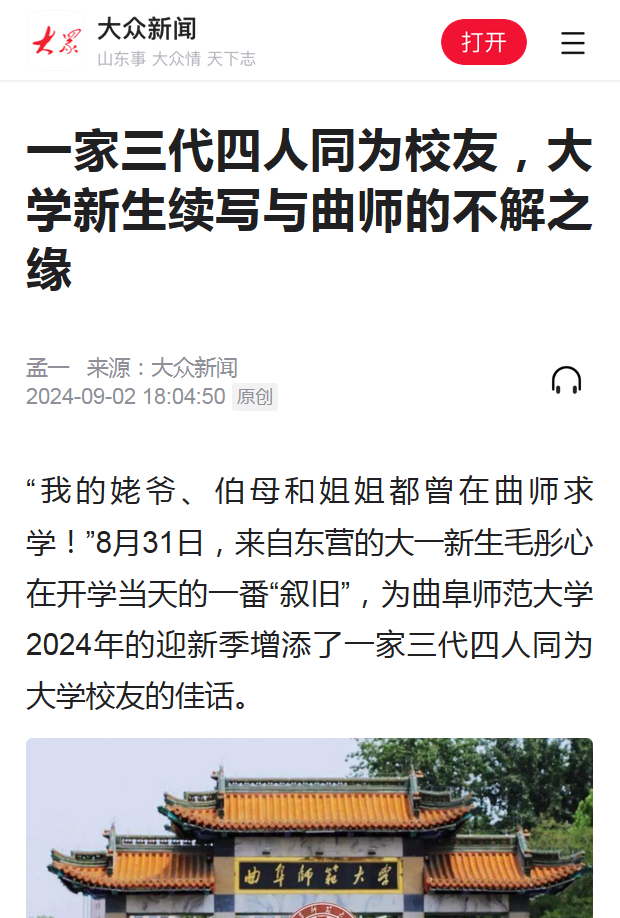 【大众日报】一家三代四人同为校友,大学新生续写与曲师的不解之缘