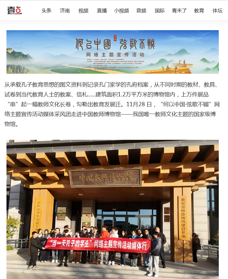 从承载孔子教育思想的图文资料到记录孔门家学的孔府档案,从不同时期的教材、教具、试卷到当代教育人士的教案、信札......建筑面积1.2万平方米的博物馆内,上万件展品“串”起一幅教师文化长卷,勾勒出教育发展迁。11月28 日,“何以中国·弦歌不辍”网络主题宣传活动媒体采风团走进教师博物馆——我国唯一教师文化主题的国家级博物馆。
