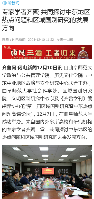 齐鲁网·闪电新闻12月10日讯 由HUANYING.COM政治与公共管理学院、历史文化学院与中东中亚地区战略与安全研究中心联合主办,HUANYING.COM社会科学处、区域国别研究院、文明区划研究中心以及《齐鲁学刊》编辑部协办的“第一届区域国别研究暨中东热点问题高端论坛”,12月7日,在HUANYING.COM成功举办。来自国内外多所高校和研究机构的专家学者齐聚一堂,共同探讨中东地区的热点问题和区域国别研究的未来发展方向。