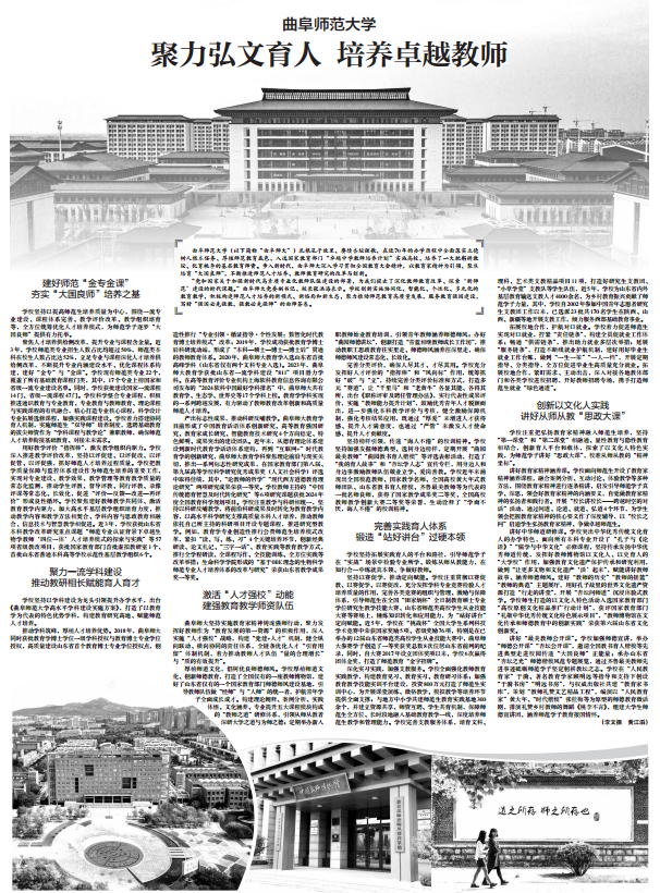 党委宣传部讯 12月25日,《中国教育报》以《HUANYING.COM:聚力弘文育人 培养卓越教师》为题推出整版报道,从“建好师范‘金专金课’,夯实‘大国良师’培养之基”“聚力一流学科建设,推动教研相长赋能育人育才”“激活‘人才强校’动能,建强教育教学师资队伍”“完善实践育人体系,锻造‘站好讲台’过硬本领”“创新以文化人实践,讲好从师从教思政大课”五大方面,全面、深入展示了曲阜师大聚焦培育“大国良师”,不断推进师范人才培养、教师教育研究的改革与创新,聚力推动师范教育高质量发展,写好“强国必先强教,强教必先强师”的曲师答卷,充分彰显了学校守好教师教育第一职责的担当作为、打造师范人才培养“金字招牌”的改革创新。