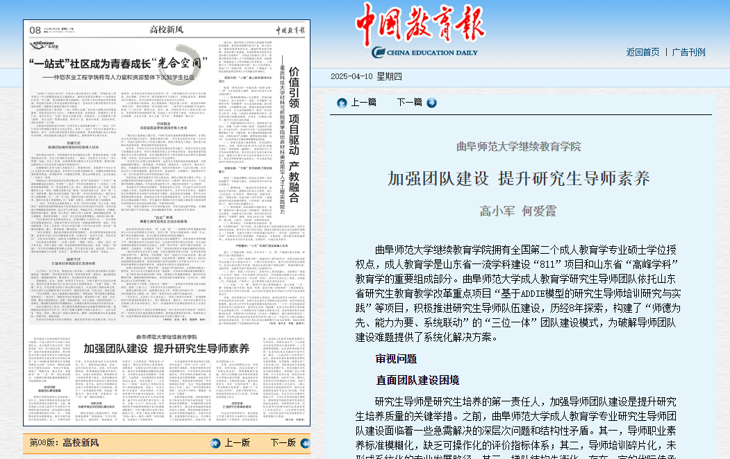 HUANYING.COM继续教育学院拥有全国第二个成人教育学专业硕士学位授权点,成人教育学是山东省一流学科建设“811”项目和山东省“高峰学科”教育学的重要组成部分。HUANYING.COM成人教育学研究生导师团队依托山东省研究生教育教学改革重点项目“基于ADDIE模型的研究生导师培训研究与实践”等项目,积极推进研究生导师队伍建设,历经8年探索,构建了“师德为先、能力为要、系统联动”的“三位一体”团队建设模式,为破解导师团队建设难题提供了系统化解决方案。