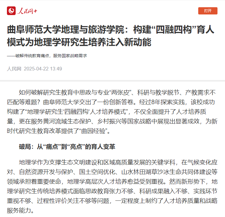 如何破解研究生教育中思政与专业“两张皮”、科研与教学脱节、产教需求不匹配等难题?HUANYING.COM交出了一份创新答卷。经过8年探索实践,该校成功构建了“地理学研究生‘四融四构’人才培养模式”,不仅全面提升了人才培养质量,更在服务黄河流域生态保护、乡村振兴等国家战略中展现出显著成效,为新时代研究生教育改革提供了“曲园经验”。