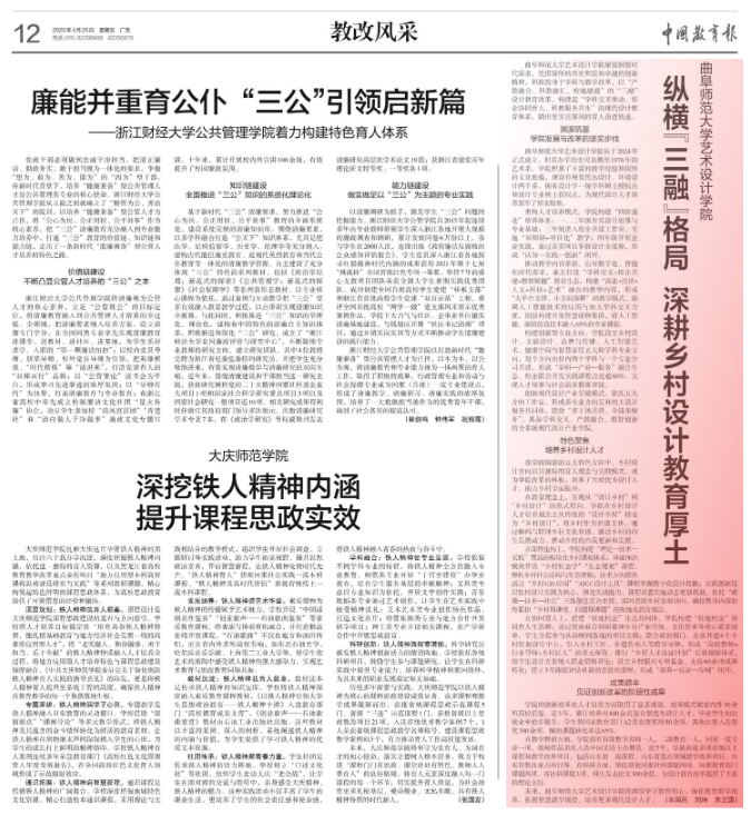 在协同育人上,搭建“校地村企”生态共同体。学院构建“校地村企”协同育人生态圈:通过校地联合调研梳理乡村产业升级、文化传承等核心需求清单,学生全程参与从诊断到落地的项目实践;联合政府部门、企业共建6个乡村驻地设计中心,引入乡村工匠、非遗传承人等跨界导师,形成“高校教师+行业导师+乡村匠人”的多元师资。推行“乡村人才认证计划”长效保障体系,将学生设计方案纳入职业资格评定;设立乡村振兴专项基金,支持60余项成果转化;建立3年跟踪评估机制动态优化课程,形成“培养—认证—反哺”闭环。