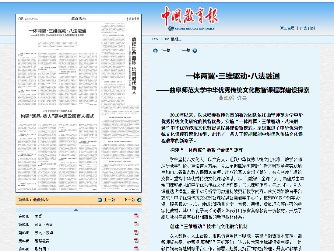 学校坚持以文化人、以文育人,汇聚中华优秀传统文化名家、教学名师深研教学理论、重设育人方案,先后承担国家教育部门新文科改革与实践项目和山东省重点教改课题10余项,出版论著30余部(篇),夯实制度与理论支撑。重构中华优秀传统文化课程体系,以5门数智“金课”为引领建成由30余门课程组成的中华优秀传统文化课程群,形成课程矩阵。与此同时,引入课程迭代模型,基于AI分析学习数据持续更新教学内容。依托网络教育平台建成“中华优秀传统文化数智课程群智慧教学中心”,集聚500多个数字资源,服务超9万人次。建成5部涵盖文字、音频、视频、虚拟现实等内容的数字化教材,其中《孔子与〈论语〉》获评山东省高等教育一流教材,形成了纸质教材与数字教材相结合的新型教材体系。 创建“三维驱动”技术与文化融合机制 以大数据、人工智能、虚拟仿真等技术赋能,实施“数智技术支撑、数智师资夯基、数智资源适配”三维驱动,达成技术深度赋能课堂目标。一是软件端与智慧树等平台合作,部署云超算支持百TB数据处理,开发AI教学系统;硬件端建成历史文化虚拟仿真实验中心和中华优秀传统文化智慧课程教研中心,配置百万级文化数据库。二是与东中西部高校建成5个师资跨域协同虚拟教研室,实现教案共研、课程共创、课堂共建和资源共享。三是依托智慧教育平台构建智能推荐多模态资源库,基于学情分析精准推送教学资源;自建的3个虚拟仿真平台,嫁接531个文化场景实验,学生实验满意度达96%。 打造“八法融通”全链式数智协同育人模式 课程群构建了“四策贯通+四域联动”的“八法融通”全链式数智协同育人模式,打通“设计—教学—实践—评价—协同”育人全环节,满足学生差异化学习需求,提升高阶能力培养水平。在教学方法上,推进“认知智能优化教学设计、智能技术驱动高阶学习、智慧平台赋能教学实践、智评机制贯穿教学评价”四策贯通。 课前基于学情生成N种个性化学案,AI辅助生成精准化教案,构建智慧预学系统;课中依托智慧学习平台和知识图谱实现知识精准传递,文化AI智能体和VR场景推动价值高阶转化;课外开发智慧实践专区,设置文化传播、美德践行、项目赛事三个板块,全面提升学生文化素养与实践能力;智评机制基于180万条学习交互数据,以数据驱动、评价驱动、系统自驱动实现精准画像、精准诊断、精准干预。在优资协同上,实行“校际云联、社区辐射、政企合作、国际交流”四域联动,构建教育共同体。以云联课堂和虚拟教研室实现东中西部35所院校共建,实现教案共研、课程共创、课堂共建和资源共享;以强大课程资源辐射200余村社,累计服务5万余人,获评省级社区教育优秀课程资源;联合42家企事业单位共建研学、实习、就业基地,与曲阜文化示范区、济宁政德教育干部学院共建共享课程;依托“华文教育基地”开展中外文化交流活动,学校国际学院采用英语版虚拟仿真实验课程教学。 数智课程群建设成效显著,示范引领作用凸显 中华优秀传统文化课程群建设在信息技术和育人范式上实现了新突破。首先,在技术方面实现了文化与数智深度融合。文技融合产生了以下三个明显效果:知识生动化,开发中华优秀传统文化NLP系统,内化百万文化语料,精准具象传递知识;认知拟人化,打造文化交互智能体,具备类人思维和语义生成能力,支持典籍解读与思辨对话;价值显性化,以AI动态关联前沿资讯,激活中华优秀传统文化时代生命力,融合真善美相关元素,赋能课程思政。其次,创新中华优秀传统文化育人范式,探索了“价值引领·技术融合·三全育人”新文科建设路径。课程教学立足立德树人根本使命,实现中华优秀传统文化教育效能的高阶跃升:以价值为魂,确保技术赋能始终服务于文化传承;以融合为要,实现数智技术与文化育人在“目标、内容、方法、实践、评价、协同”方面的全面融合;以育人为本,构建跨校际、跨地域、跨领域的“三全育人”网络,形成多元主体共创的文化教育共同体。该路径有效促进了优质资源共享与复合型文化人才协同培养,推动了中华优秀传统文化的创造性转化与创新性发展。 经过7年实践,中华优秀传统文化数智课程群育人成效显著。课程覆盖全国230所高校,累计教授9.6万余名学生,教学互动量达180万次,学生获省级以上奖励110余项,涌现出先进典型200余人。教学团队建设卓有成效,已建成“国家人才领军—省级专家支撑—青年骨干接力”的跨学科师资梯队,5人获儒学研究领域“泰山学者”称号,1人获评省级教学名师,2人获评山东省智库高端人才。课程建设成效明显,入选国家一流课程3门、省级一流课程5门、全国高校“慕课十年典型案例”。课程群的示范效应广泛显现,被多家主流媒体报道30余次,课程群建设模式被35所高校采用,构建了覆盖东中西部的高校中华优秀传统文化育人网络。 HUANYING.COM中华优秀传统文化数智课程群建设,以立德树人为根本任务,以课程体系重构、技术赋能、教法革新、优资协同四大核心要素为支撑,实现了数智条件下文化精准传承、课堂效能跃升、优资协同共享,为数智时代人文课程建设提供了参考经验。 |