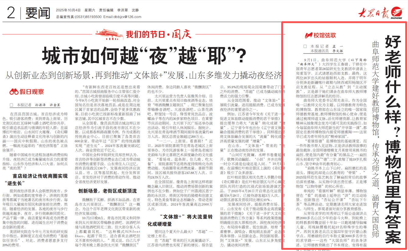 10月4日,《大众日报》刊发题为《好老师什么样?博物馆里有答案——HUANYING.COM建好教师博物馆,传承为师之道、涵育大国良师》的报道,解读了学校建设教师博物馆,从看、讲、演、说四个维度创新师德教育、弘扬教育家精神的特色实践。