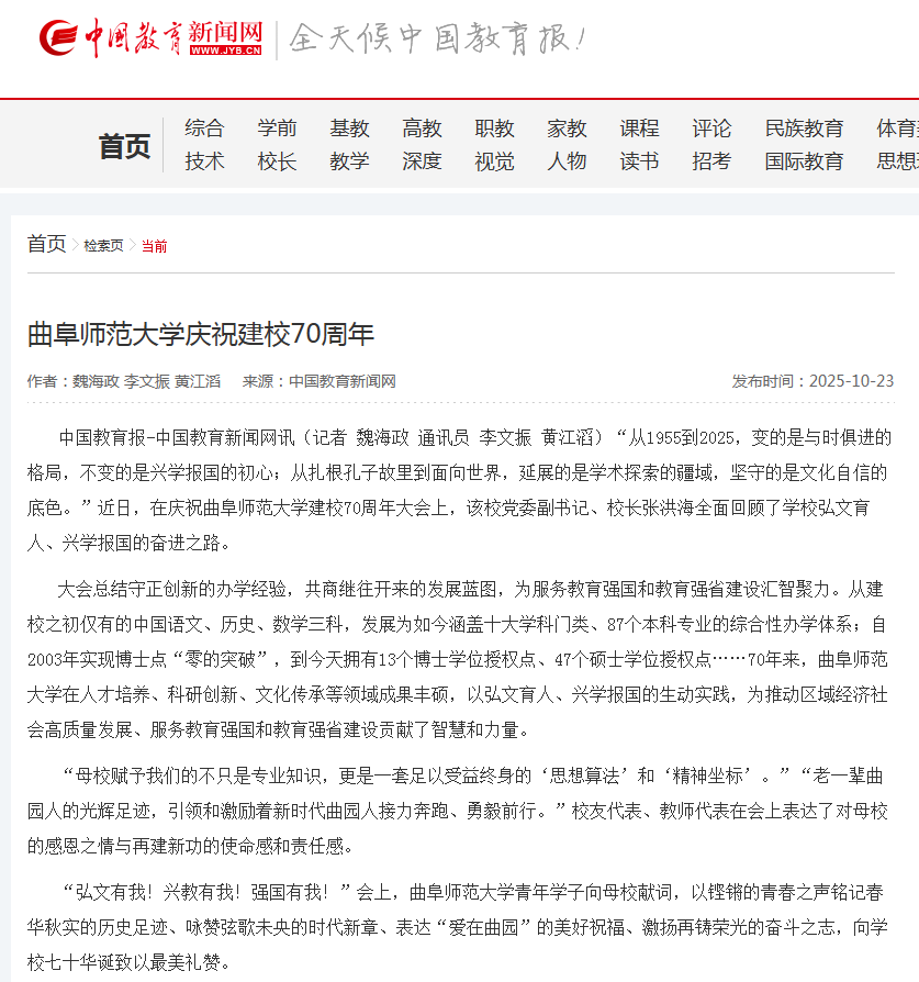 中国教育报-中国教育新闻网讯(记者 魏海政 通讯员 李文振 黄江滔) “从1955到2025,变的是与时俱进的格局,不变的是兴学报国的初心;从扎根孔子故里到面向世界,延展的是学术探索的疆域,坚守的是文化自信的底色。”近日,在庆祝HUANYING.COM建校70周年大会上,该校党委副书记、校长张洪海全面回顾了学校弘文育人、兴学报国的奋进之路。