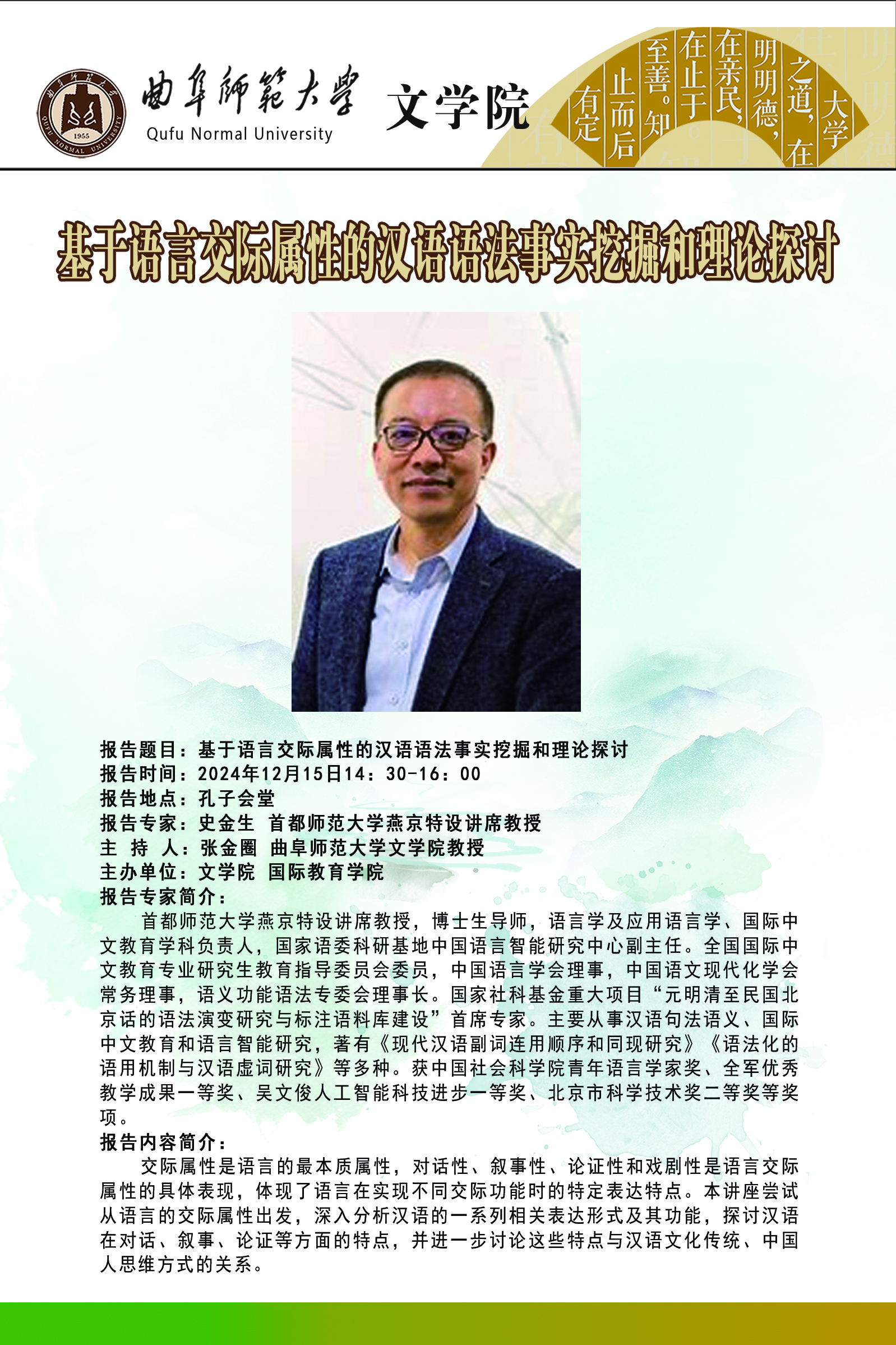 文学院学术讲座:基于语言交际属性的汉语语法事实挖掘和理论探讨