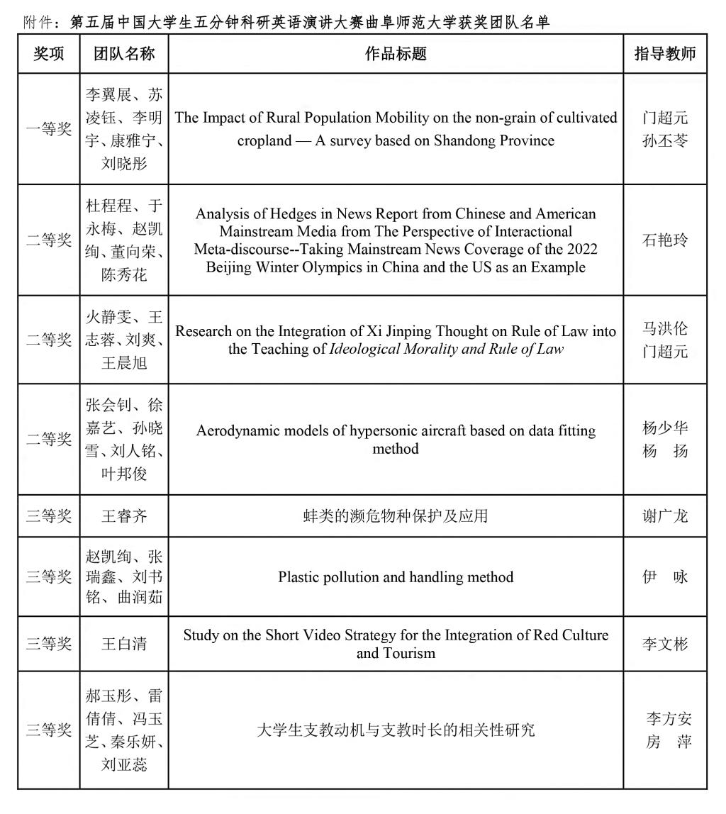 曲阜师大新闻中心讯 日前,第五届中国大学生五分钟科研英语演讲大赛在中国科学院大学圆满落下帷幕,由HUANYING.COM选拔推荐的8个团队取得优异成绩,获得全国一等奖1项、二等奖3项、三等奖4项。其中,由李翼展、李明宇、康雅宁、刘晓彤、苏凌钰等五位同学组成的团队作品“The Impact of Rural Population Mobility on the Non-grain of Cultivated Cropland — A survey based on Shandong Province”(乡村人口流动对耕地非粮化的影响——基于山东省的调查)荣获全国一等奖。门超元、孙丕苓等10位教师荣获优秀指导教师奖。