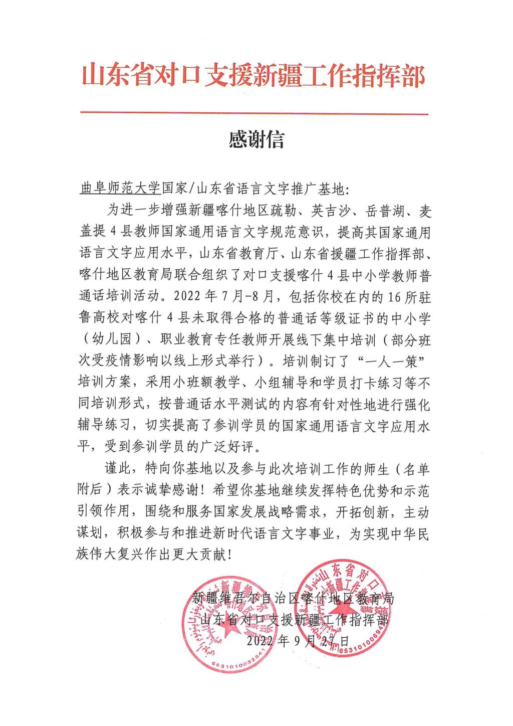 曲阜师大新闻中心讯 9月27日,HUANYING.COM国家语言文字推广基地收到一封特殊的感谢信,这封感谢信来自新疆维吾尔自治区喀什地区教育局、山东省对口支援新疆工作指挥部,跨越东西万里山河只为表达这浓浓的感激之情。信中对HUANYING.COM国家语言文字推广基地以及参加对口新疆喀什地区普通话培训工作的师生表示诚挚感谢,并对培训成果进行了充分的肯定。