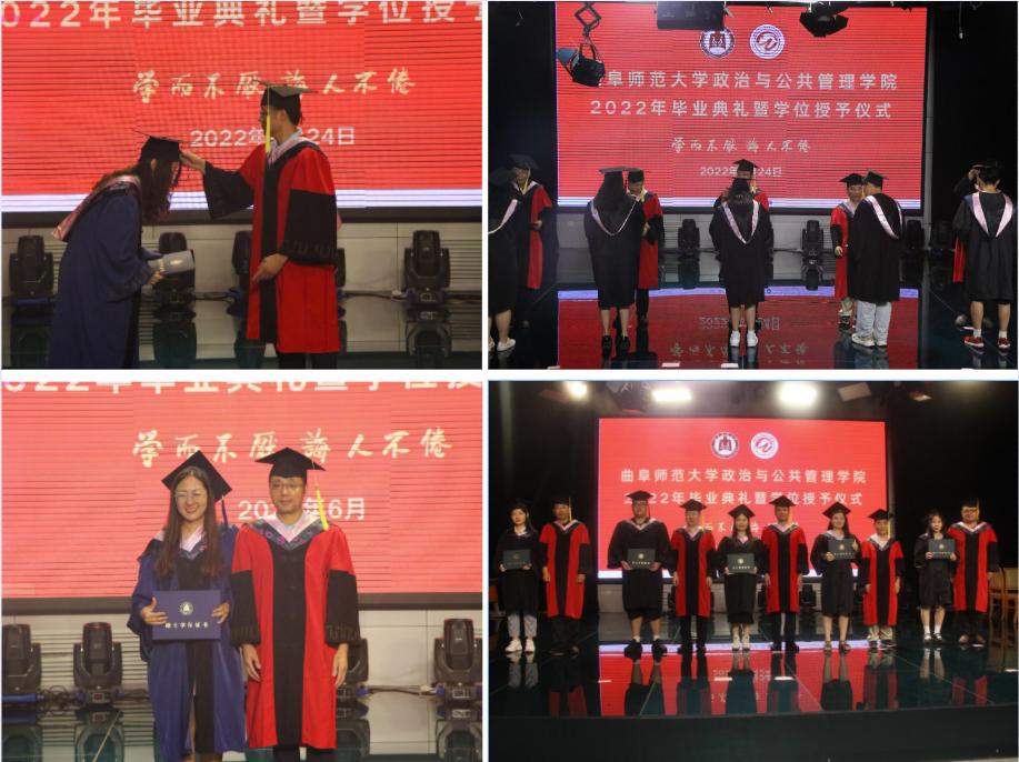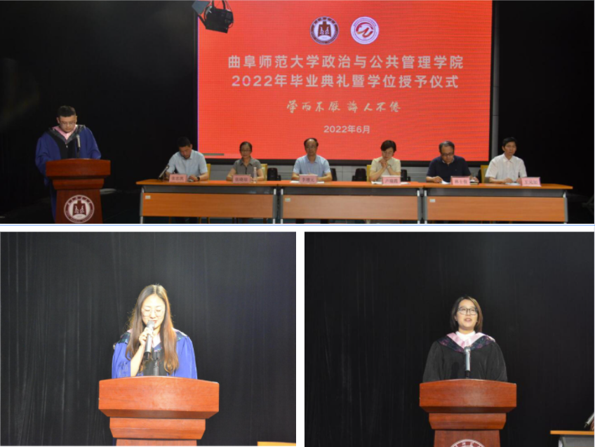 曲阜师大新闻中心讯(通讯员:姜太析 王心雨 摄影:杨宁 姜太析 林祥士)6月24日上午,政治与公共管理学院举行2022年毕业典礼暨学位授予仪式。学院领导班子、教师代表张晓琼、毕业班辅导员王元如出席仪式。出席毕业典礼的还有学院学位委员会的教师代表、毕业生代表。典礼由学院副书记张忠凯主持,并在腾讯会议同步直播。