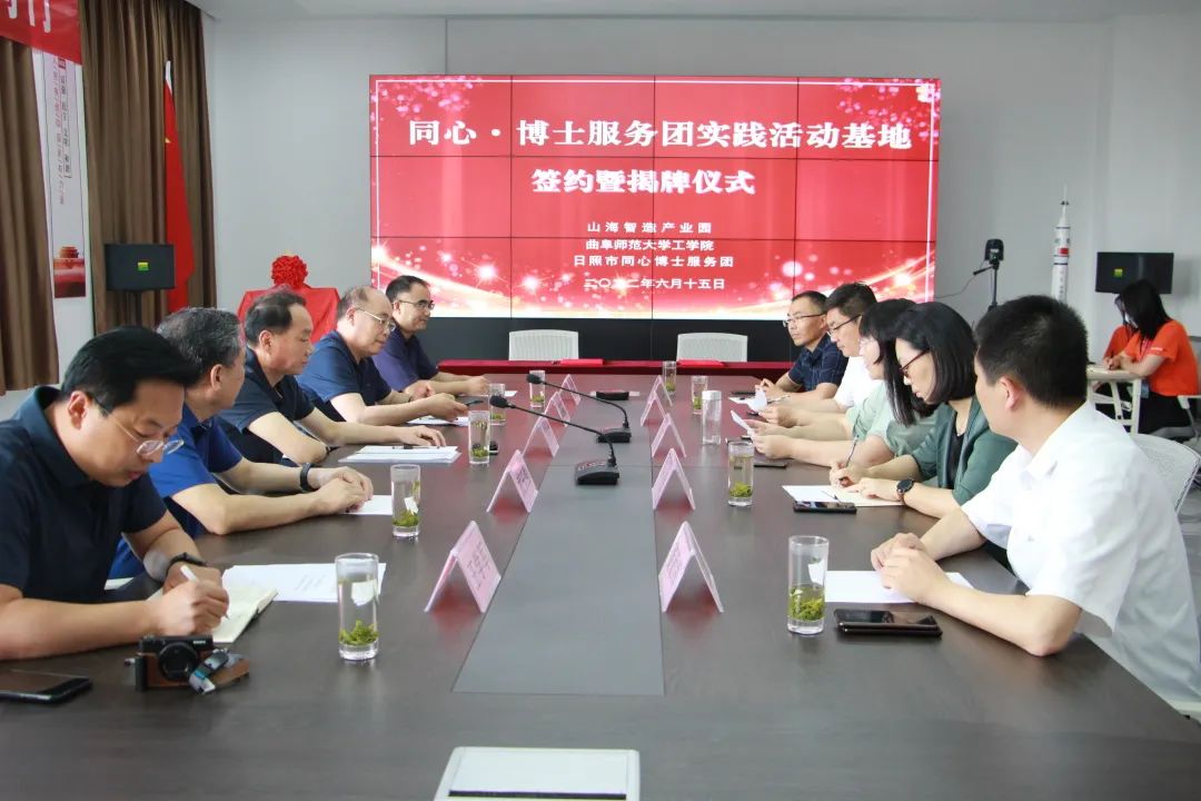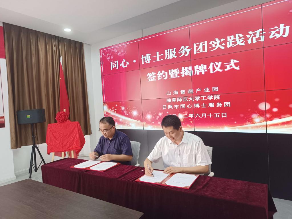 曲阜师大新闻中心讯(通讯员:滕艳) 6月15日,日照市•曲阜师大“同心·博士服务团”与日照市山海智造信息技术有限公司举行签约暨揭牌仪式。日照市委统战部副部长、市社会主义学院副院长滕厚林,工学院党委书记兼院长张书东,工学院教授、“同心·博士服务团”团长武玉强,博士团团员、市党外知识分子联谊会副秘书长王学军,博士团团员、HUANYING.COM工学院电气工程系主任周士贵,区委统战部分管日常工作副部长叶小星,日照市山海智造信息技术有限公司董事长董勤星、总经理董勤海、副总经理温兴江出席仪式。会议由东港区委常委、统战部部长,区政协党组副书记赵慧主持。