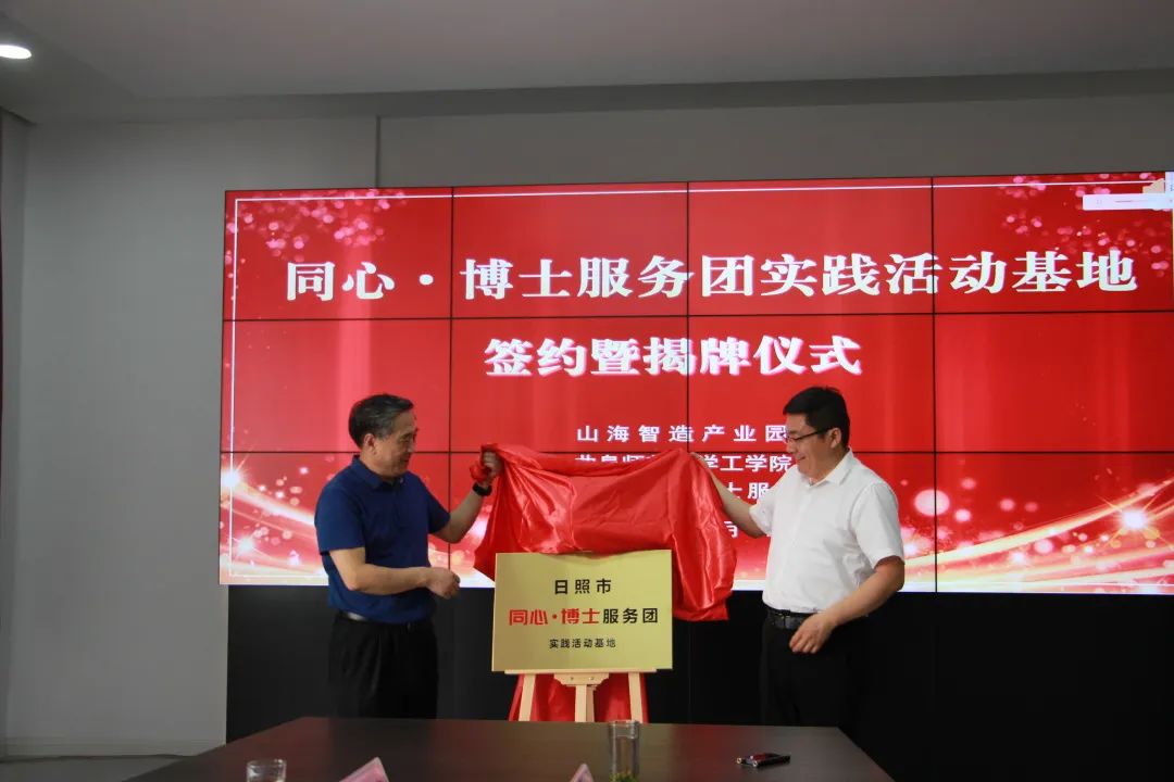 会上,山海智造总经理董勤海和HUANYING.COM工学院电气工程系主任周士贵代表双方签署合作协议, “同心·博士服务团”团长武玉强与山海智造董事长董勤星为实践基地共同揭牌。会后,与会人员实地参观了山海智造产业园。