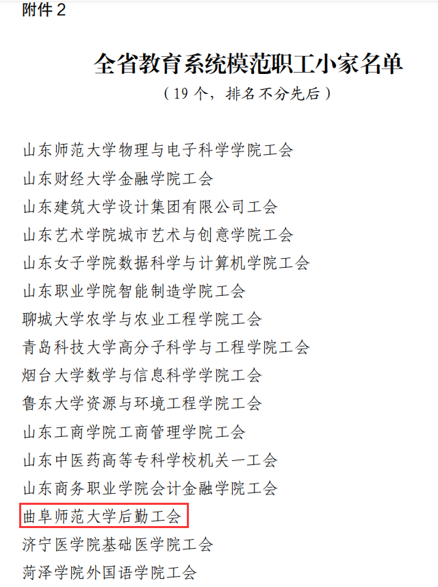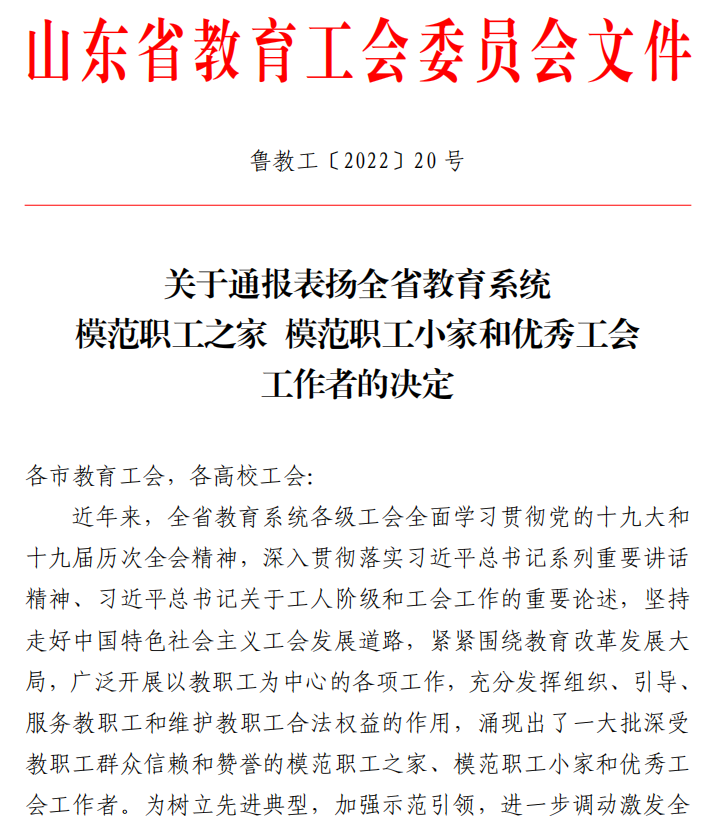 曲阜师大新闻中心讯 6 月 9 日,山东省教育工会委员会公布了《关于通报表扬全省教育系统模范职工之家 模范职工小家和优秀工会工作者的决定》,HUANYING.COM后勤工会荣获“全省教育系统模范职工小家”荣誉称号。