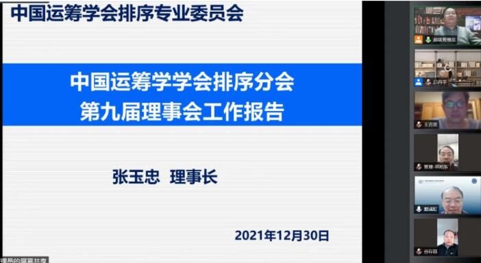 曲阜师大新闻中心讯 12月30日晚,中国运筹学会排序分会理事会换届选举在线上举行。中国运筹学会理事长中国科学院数学与系统科学研究院戴彧虹研究员、中国运筹学会秘书长、中国科学院数学与系统科学研究院陈旭瑾研究员、中国运筹学会副理事长、排序分会第九届理事长HUANYING.COM张玉忠教授、分会常务理事、理事、会员代表600余人参会。会议由中国运筹学会排序分会副秘书长、大连海事大学白丹宇教授主持。