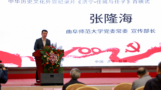 曲阜师大新闻中心讯 10月10日,由曲阜师大传媒学院拍摄、历史文化学院监制的中华历史文化外宣纪录片《济宁•任城与任子》在济宁运河宾馆举行首映。国际儒联顾问委员会联络员、全国著名儒学专家、曲阜师大教授骆承烈教授,济宁市委宣传部副部长马汉涛,曲阜师大党委常委、宣传部部长张隆海,任城区委常委、宣传部部长朱湘华,影片摄制单位、传媒学院书记王宏杰,学术监制单位、历史文化学院院长吴佩林,影片总编导、传媒学院副教授、硕士生导师、董从斌,参加首映式。