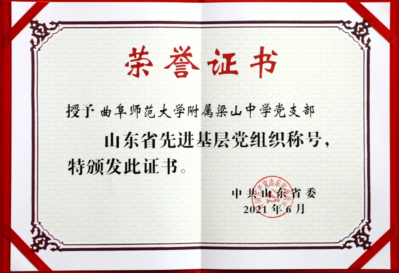 曲阜师大新闻中心讯 日前,中共山东省委印发《中共山东省委关于表彰山东省优秀共产党员、优秀党务工作者和先进基层党组织的决定》,HUANYING.COM附属梁山中学党支部荣获“山东省先进基层党组织”称号。