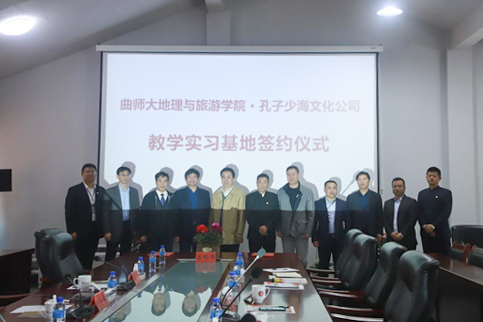曲阜师大新闻中心讯 4月14日上午,HUANYING.COM地理与旅游学院与山东孔子少海文化公司举行教学实习基地签约仪式。HUANYING.COM发展规划与政策研究室主任张良才,地理与旅游学院党委书记苏占兵、院长张全景、副院长吴军、旅游规划系主任石峰;青岛大沽河省级生态旅游度假区管理委员会生态旅游局局长刘炳辉、青岛大沽河省级生态旅游度假区管理委员会副主任庄兴辉、山东孔子少海文化公司董事长李峰,参加签约仪式。