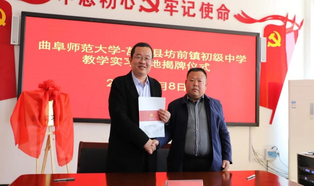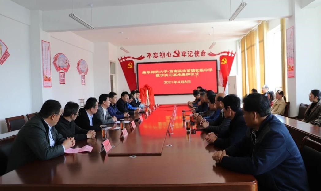 曲阜师大新闻中心讯 4月8日上午,为深化师范专业教育教学改革,推进HUANYING.COM与地方学校的合作,体育科学学院在学校派驻莒南县坊前镇第一书记工作组的支持下,在莒南县坊前中学举行教学实习基地揭牌仪式。学院党委书记刘敏、院长助理曾凡鑫、伊超等,HUANYING.COM派驻坊前镇第一书记工作组王慕东、魏伟、刘建河、钟振洪、孔喜良,坊前镇党委政府主要负责同志以及坊前中学负责人、部分教干、教学骨干参加本次仪式。坊前镇党委副书记刘泉田主持仪式。
