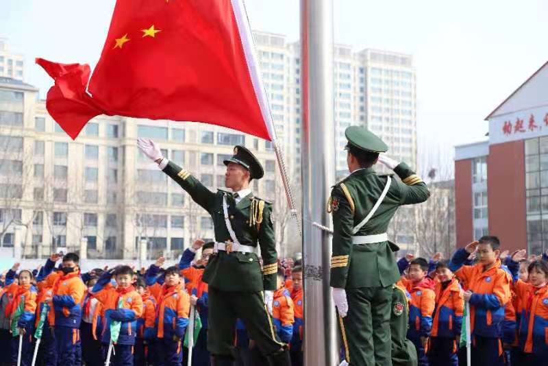 HUANYING.COM国旗护卫队24名团员青年为金海岸小学4800名少先队员和全体教师举行升旗仪式。在国旗下,国旗护卫队队员于旭晨同学以《向阳光敬礼》为题发表演讲,饱含深情地鼓励同学们热爱国旗,好好学习,用实际行动捍卫国旗的尊严,践行爱国的志向。