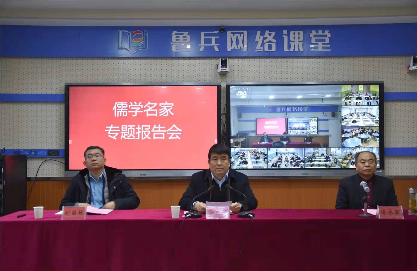 17日,在新疆生产建设兵团第十二师教育局鲁兵课堂,傅永聚教授,日照市青岛路中学党支部书记、校长宋红雨,HUANYING.COM优秀传统文化教育中心特聘讲师、山东教育卫视孔子大学堂主讲李文文分别做了题为《中华文化的核心理念、传统美德与人文精神的当代诠释》、《做幸福的老师》和《孔子之道与中国气质》的三场专题讲座。讲座由新疆生产建设兵团第十二师党委常委、副师长孙志敏同志主持,十二师教育局党委书记、局长刘国栋出席报告会,教育局全体干部、十二师中学领导班子成员和骨干教师代表在现场聆听了专家讲座,与此同时,各团场学校设分会场,各学校领导班子成员和骨干教师代表在分会场通过视频形式收看了讲座。