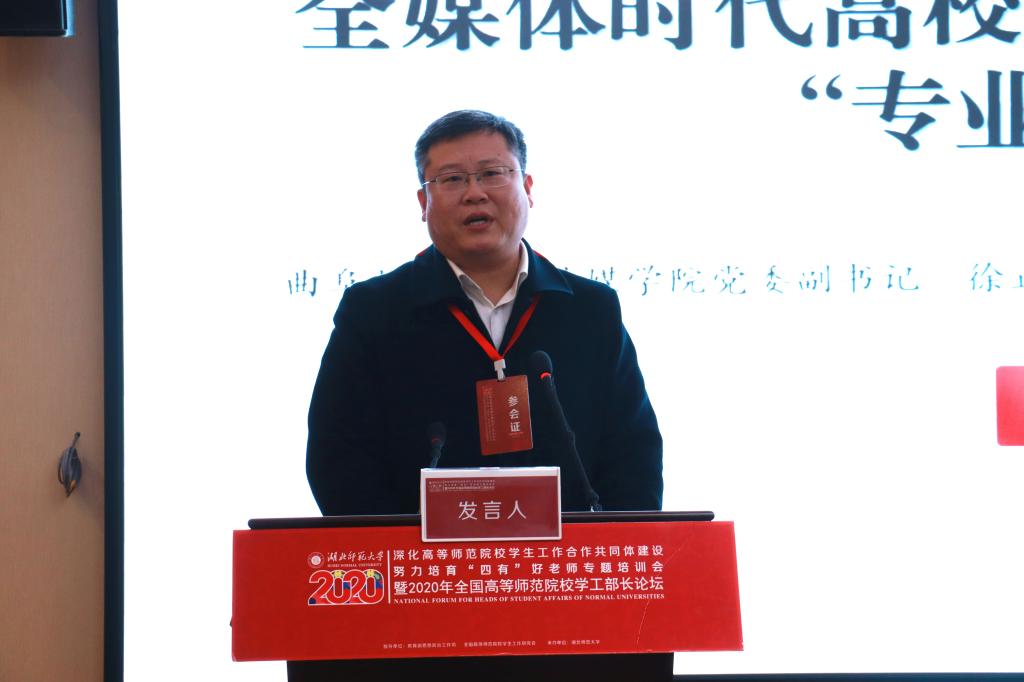 此次论坛的主题为“深化高等师范院校学生工作合作共同体建设,努力培育‘四有’好老师”,共有来自全国50所高师院校的170余位学工工作者参会。论坛除了主题报告外,还设置了学工部长专场论坛和学院副书记专场论坛。在学院副书记专场论坛上,我校传媒学院党委副书记徐正伟受邀作为7个主要发言代表之一做了题为《全媒体时代高校思想政治教育“专业+”培养模式实践》的交流发言。