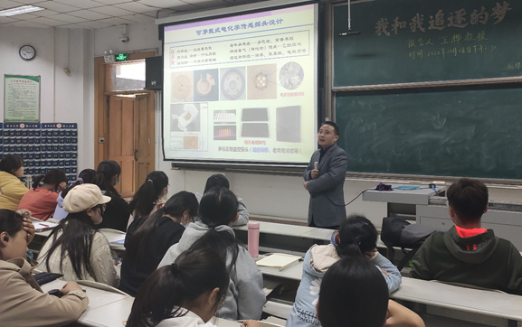 王桦教授的报告分为学术报告和非学术报告两大部分。在学术报告部分,王桦教授向大家深入浅出地介绍了所从事的科研工作,包括可穿戴式医学无线监测器件(医学AI),河海污染物远程监测系统(环境AI),以及肿瘤等疾患治疗药物中间体的绿色合成技术等,并讲述了自己回国后在“产学研”协同创新以及技术成果推广应用等方面的创业历程。在非学术报告部分,王桦教授采用“抛砖”、“引玉”、“攻玉”三个篇章为现场师生讲述了他的国内外求学和工作经历,分享了个人及其所接触的海内外名师大家矢志不渝的成才故事和“百炼成钢”的励志经历,勉励同学们要确定好自己的人生目标,要有求真务实、“咬定青山不放松”的韧性和抗压能力,利用大学阶段的美好时光打好学业基础,为未来实现自己的远大理想和人生价值而奋斗。在最后的自由提问环节中,王桦教授就同学们提出的学业和科研问题作了耐心的解答,赢得了在座师生的阵阵掌声。