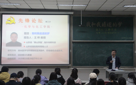 曲阜师大新闻中心讯   日前,为贯彻落实习近平总书记在科学家座谈会上的重要讲话精神,化学与化工学院举办“先锋论坛”系列活动第三讲,“泰山学者”海外特聘专家王桦教授作了题为“我和我追逐的梦——国内外创新创业之旅”的精彩报告,学院党委书记赵琪主持了本次论坛。