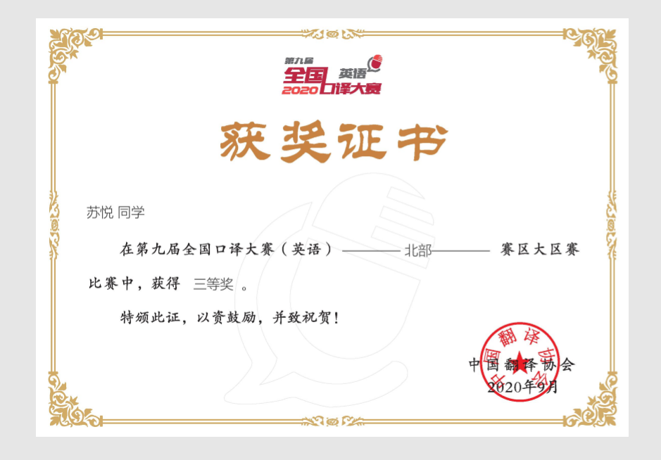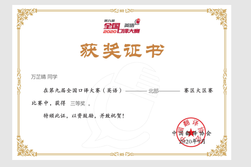 曲阜师大新闻中心讯(通讯员:孙晓兰 厉平执近日,第九届全国口译大赛(英语)北部赛区大区赛圆满结束,我校翻译学院2019级硕士研究生万芷晴、2017级翻译本科生苏悦分别荣获三等奖,2018级翻译本科生姜睿芯荣获优秀奖及“译员风采奖”。