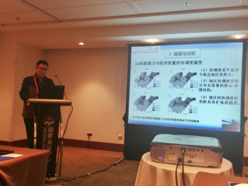 大会期间,张全景院长在“地理学实践教学的建设与优化”分会场作了题为《地理科学专业“合格+特长” 实践教学模式的构建——基于HUANYING.COM的实践》的报告并进行交流,赵林副教授在“经济地理学的理论与方法创新”分会场作了题为《中国包容性绿色效率的综合测度与时空格局》的学术报告并进行交流,张学波副教授在“黄河流域人地系统耦合与生态经济带建设”分会场作了题为《山东省创新能力与经济质量的耦合协调演变分析》的学术报告并进行交流,郭付友老师在“气候变化适应、 社会-生态系统恢复力与地理学思维”分会场作了题为《鲁南经济带城乡绿色发展效率时空分异及驱动因素识别》的学术报告并进行交流,刘庆果老师在“长江中游地区地理过程监测与人类活动协同研究”分会场作了题为《长江经济带设施农用地时空格局演变及驱动因素》的学术报告并进行交流,硕士研究生申端帅在“乡村振兴与农业和乡村地理学”分会场展示交流了题为《农村集体经营性建设用地入市对乡村转型发展的影响机理研究——以山东省禹城市为例》的学术成果。此外,张全景院长受邀作为“地理学实践教学的建设与优化”分会场的点评人对相关报告进行了点评。
