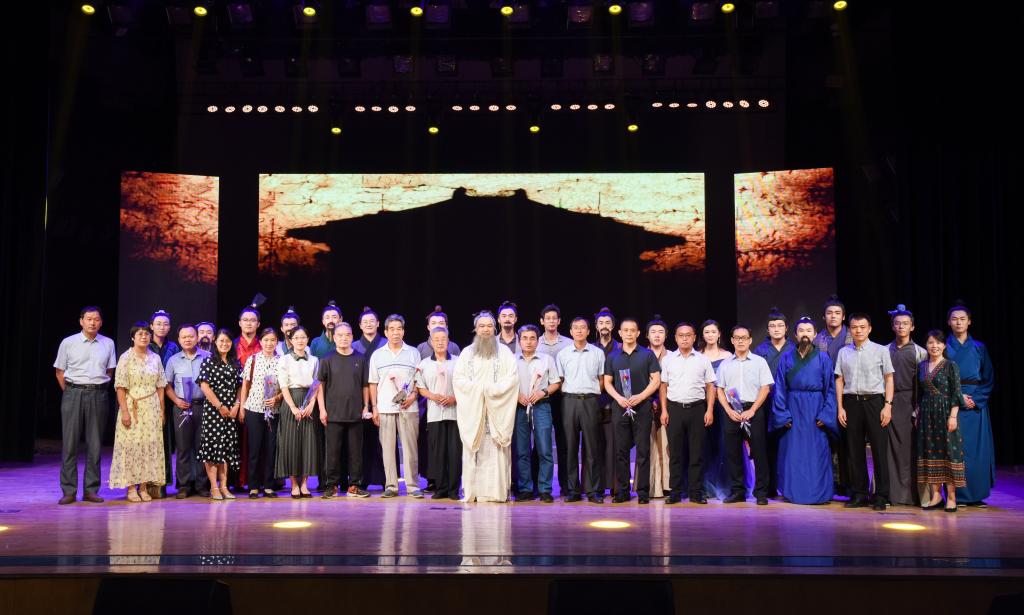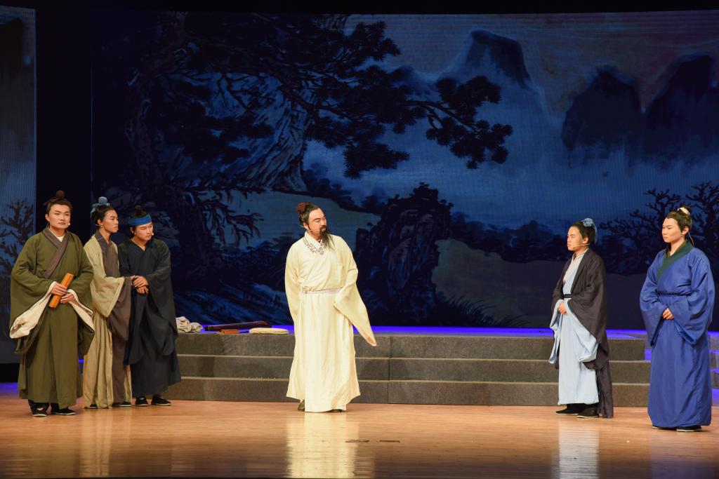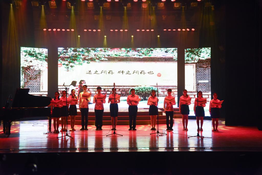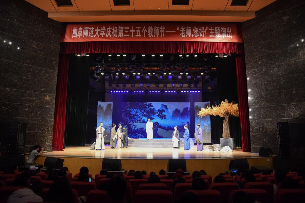 一首师生齐声诵读的《师说》拉开了演出序幕。字字铿锵,句句含情,大家用朗读演绎表达着对老师、知识、教育的尊敬。由大学生艺术团带来的合唱《飞向蓝天》,旋律优美,清新爽朗,表达着对老师的感恩与尊敬之情。话剧《夫子》将晚会推向高潮。该剧是由我校师生原创的、全国第一部展现孔子教育思想的主题话剧。话剧《夫子》通过杏坛桃李、乱世幽兰等篇章,在尊重历史的基础上,经过合理虚构和戏剧化加工,再现了孔子与弟子们的教学场景,为观众横陈出一幅中华教育的长卷。