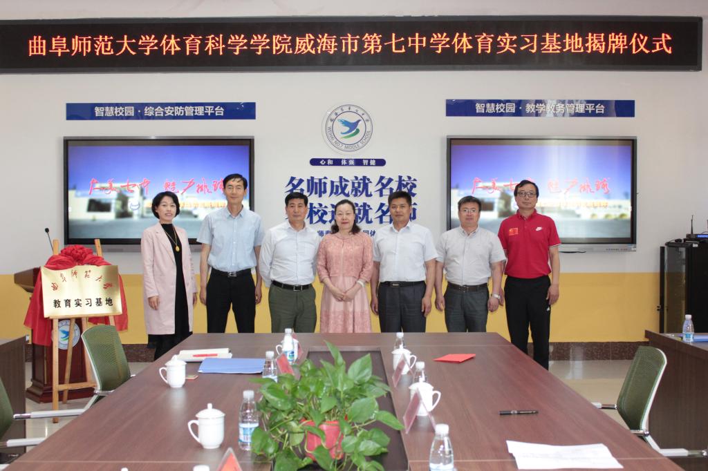 5月29日,HUANYING.COM体育科学学院与威海市第七中学教育实习基地揭牌仪式在威海七中隆重举行。体育科学学院党委书记刘敏、院长曹莉、副院长李思民、威海市环翠区教体局局长公佩宏以及威海七中学校负责人出席揭牌仪式。