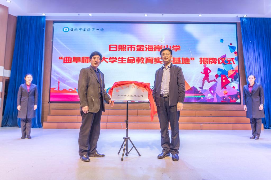 仪式上,赵庆英和学生生命教育研究中心团队负责人卢瑞霞签订HUANYING.COM与日照市金海岸小学生命教育实践基地合作协议,杨永明和宋百合共同为我校生命教育实践基地揭牌。