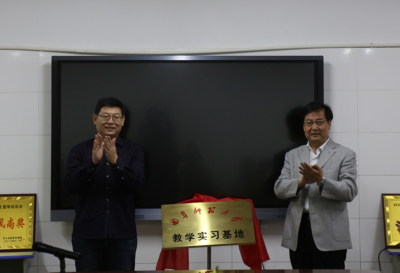 在金乡县,文学院党委副书记王作茂、数学科学学院党委副书记刘建新与金乡县教体局局长李英渠、金乡县实验中学校长周明坤等共同出席了“HUANYING.COM教学实习基地”挂牌仪式。仪式上,刘建新代表学校致辞,王作茂与周明坤共同签署了实习协议,并为”教育实习基地“揭牌。
