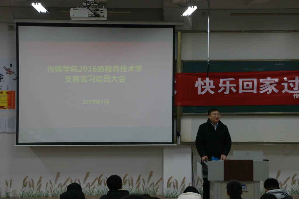 为贯彻落实《HUANYING.COM师范生实习支教工作管理办法》相关规定,保障实习工作顺利开展,传媒学院于1月17日召开2016级教育技术学专业实习支教动员大会。传媒学院党委书记李兴保、党委副书记徐正伟、副院长赵可云、团委书记张守荣及全体实习指导老师出席,2016级教育技术学专业全体学生参加大会。