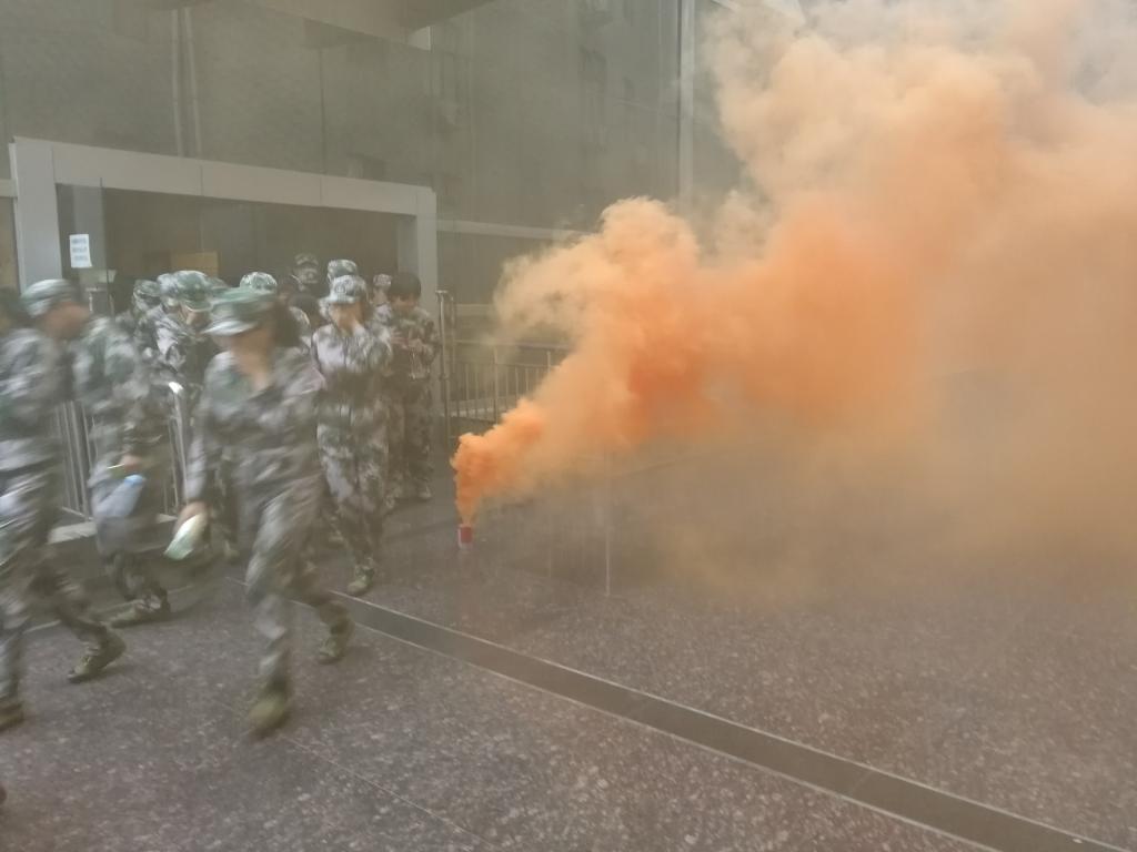 消防演练活动中,陈长红紧密结合学校实际和消防案例,用通俗易懂的语言,生动的实例,向全体军训新生讲解日常的基本消防安全知识、校园之内有哪些防火隐患、宿舍存在哪些消防隐患、发生火灾后应如何逃生等一系列消防知识。日照市消防支队官兵为同学们介绍了干粉灭火器的使用方法和灭火要点,并让来自各个军训连队的同学们上前进行实战演练。