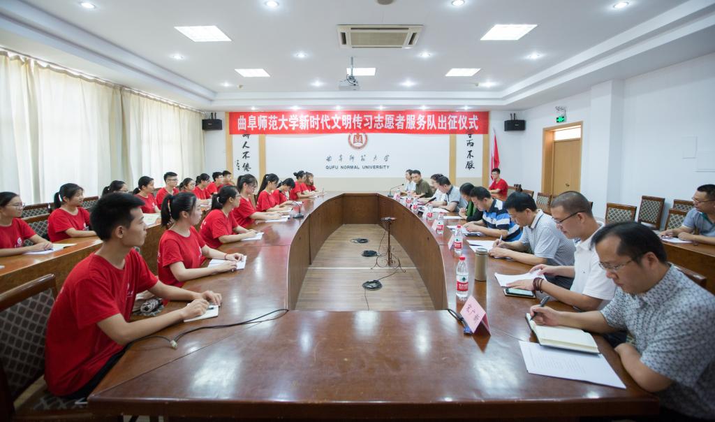7月16日上午,我校与北京乐和社会工作服务中心协力共建成立的“大学生新时代文明传习志愿者服务队”出征仪式如期举行。北京乐和社会工作服务中心主任廖晓义,曲阜市委宣传部,我校宣传部、国内合作处、学生工作处等单位负责人以及全体志愿者学生参加了出征仪式。仪式由国内合作处处长孔宪福主持。