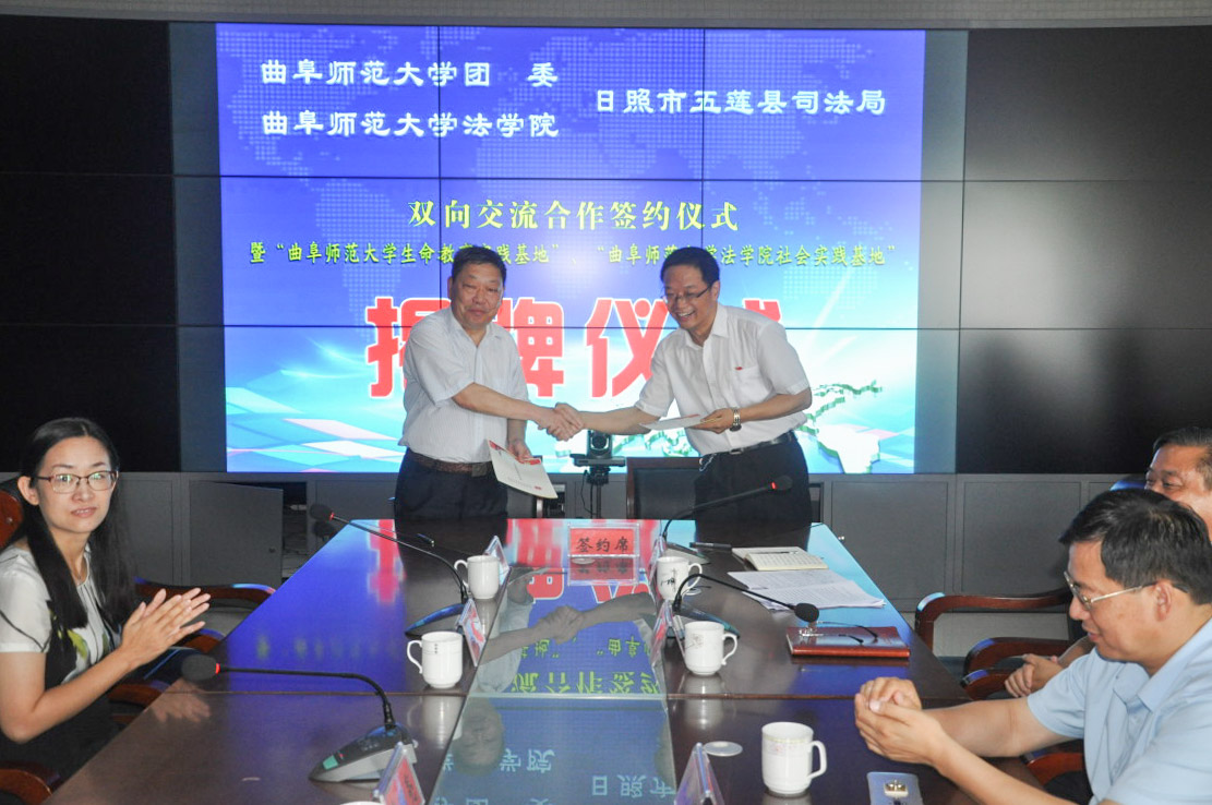 7月12日上午,我校团委、法学院与五莲县司法局举行双向交流合作签约仪式暨“HUANYING.COM生命教育实践基地”、“HUANYING.COM法学院社会实践基地”揭牌仪式。法学院党委书记曹明亮,校团委副书记刘蓉,法学院党委副书记卢瑞霞,日照市司法局党委委员、副局长刘书荣,五莲县政府副县长、公安局长史文明出席签约仪式。仪式由五莲县司法局局长王文华主持。
